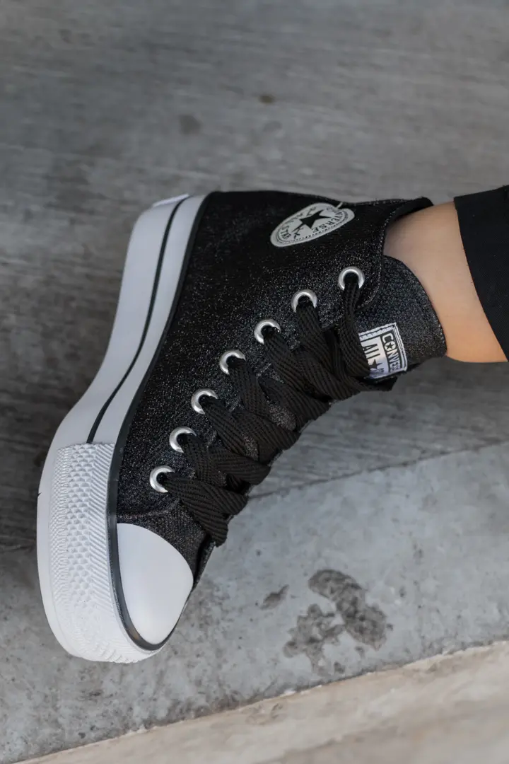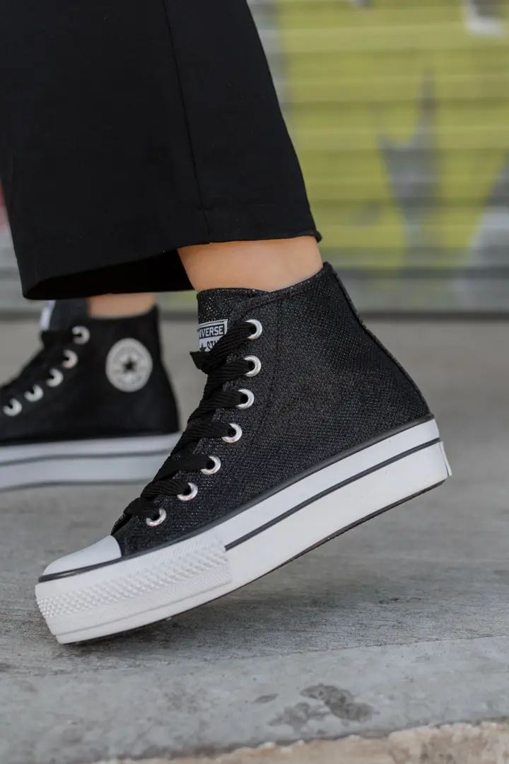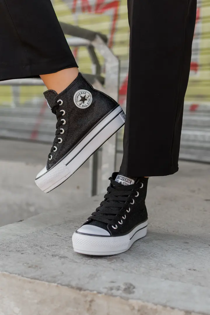 Converse de Lona Botitas con plataforma Negras con Brillo , diseño clásico , comodidad diaria y altura extra para un look urbano único ,el toque moderno que tu outfit necesita