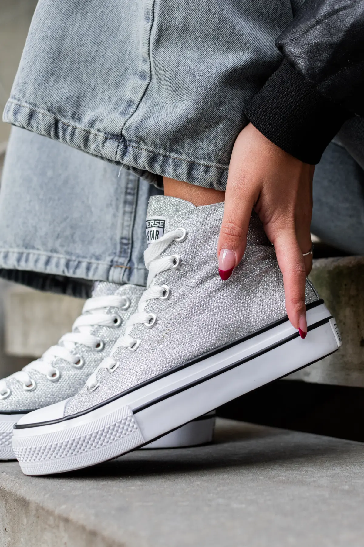 Converse de Lona Botitas con plataforma Plateadas con Brillo , diseño clásico , comodidad diaria y altura extra para un look urbano único ,el toque moderno que tu outfit necesita